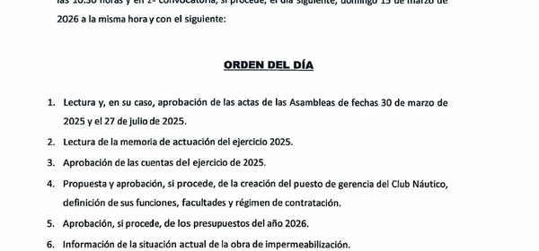 JUNTA GENERAL EXTRAORDINARIA 2017 1ª Convocatoria: viernes 04 de agosto 17:00 horas 2ª convocatoria: sábado 05 de agosto 17:00 horas Orden del día: 1.- Elección de los miembros de la Junta Directiva por finalización de mandato